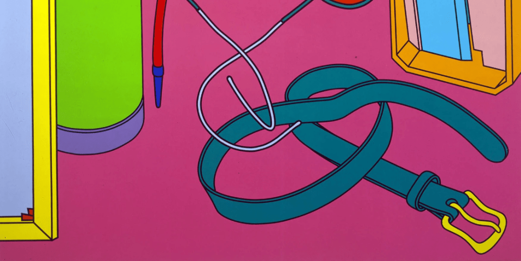 It would be easy to make the mistake that Michael Craig-Martin’s early work was highly cerebral – but that would be to deny its essential materiality, its solidity, and the implied drama inherent in its construction: so many things are only precariously secure. And in the same way, you could – and several critics do – deny that the later, highly coloured works are anything more than superficially decorative, given their saturated, attention-grabbing colour and commanding scale. But of course there is, as there always is, more to them than meets the eye. What we see in this painting is a collection of objects which may or may not be connected. Or rather, they are connected, if only because they all appear in the same painting – but is there anything else that unites them? Reading from left to right and top to bottom, we can see the back of a canvas, a mirror, a ladder, a fire extinguisher, a pair of sunglasses, a pencil sharpener and a belt. I have no doubt that these are the objects depicted in this painting, although art is subjective, and you might be seeing something else.