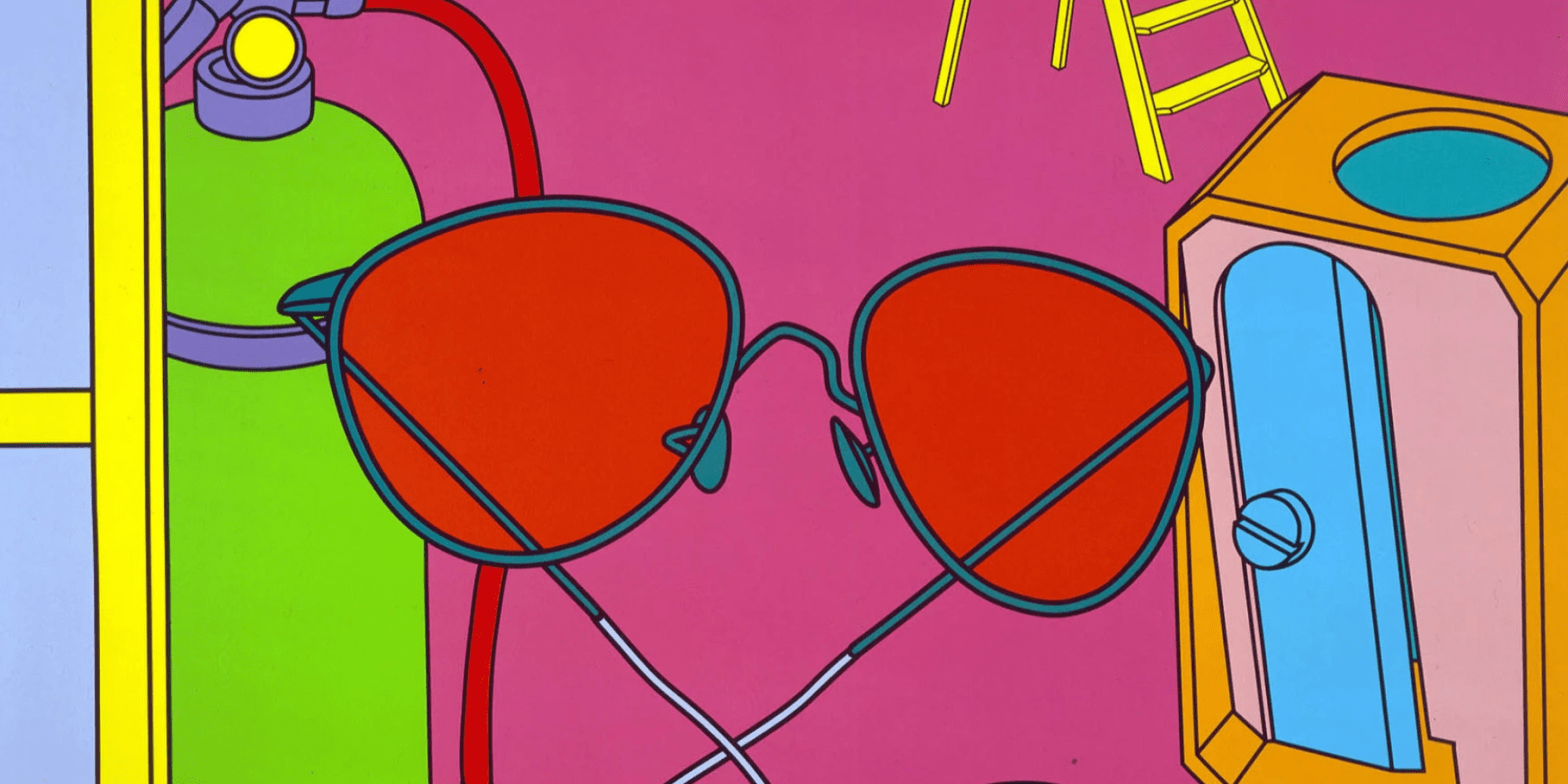 It would be easy to make the mistake that Michael Craig-Martin’s early work was highly cerebral – but that would be to deny its essential materiality, its solidity, and the implied drama inherent in its construction: so many things are only precariously secure. And in the same way, you could – and several critics do – deny that the later, highly coloured works are anything more than superficially decorative, given their saturated, attention-grabbing colour and commanding scale. But of course there is, as there always is, more to them than meets the eye. What we see in this painting is a collection of objects which may or may not be connected. Or rather, they are connected, if only because they all appear in the same painting – but is there anything else that unites them? Reading from left to right and top to bottom, we can see the back of a canvas, a mirror, a ladder, a fire extinguisher, a pair of sunglasses, a pencil sharpener and a belt. I have no doubt that these are the objects depicted in this painting, although art is subjective, and you might be seeing something else.