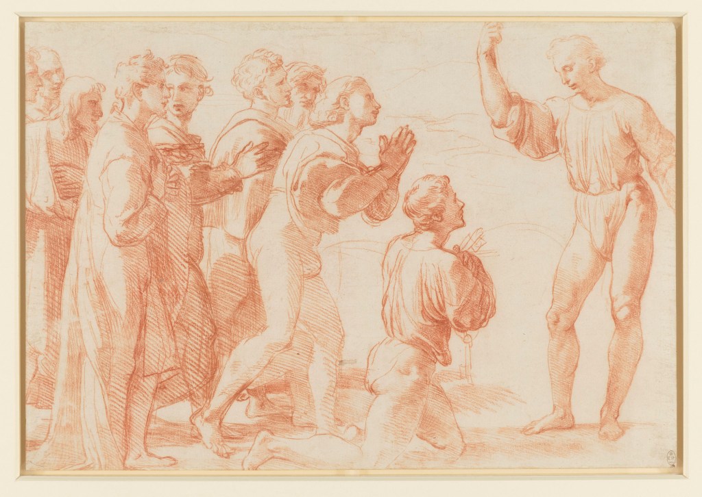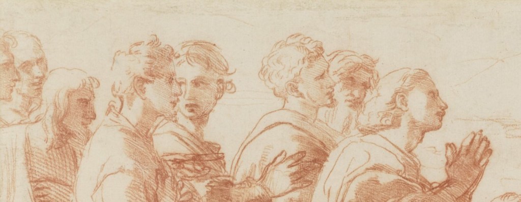One of the things I appreciate more and more is precisely how good Raphael’s drawings are, and how important they were to his process of creating art and disseminating ideas, which is why, even after posting about him for the past two weeks, I want to do so again today. This also happens to be a particularly rare type of drawing – although the reason why is not immediately apparent. We see a man on the far right pointing upwards, with a group of nine others approaching him in different attitudes, some gesturing, one starting to bow, hands in prayer, and one on his knees. We are left in no doubt as to his importance, even though there is nothing notable about his appearance – apart from the fact that he is not wearing any trousers, I suppose. This is clearly a preparatory drawing for a religious scene, but then we knew that from the title: Christ’s Charge to St Peter – but how did the people who gave the drawing that title know what was going on? After all, Jesus did not dress like this, nor was he associated with a group of nine men… However, people only kneel before people they respect or fear (or both), and there is no sense of any threat, even if one or two faces show a touch of concern. On the whole the image radiates calm, and compassion, and even communicates a sense of sanctity – but maybe that is the result of having read the title.