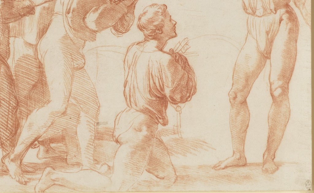 It is clear from the three figures on the right, if not the others in the group, that Raphael was using models. They could easily have been studio assistants. These three, who were wearing contemporary, 16th century clothing, have removed their breeches and hose so that Raphael could get understand the structure and articulation of the legs. He carefully demarcates the light and shade defining the forms of the muscles, bones and tendons. If the legs, whether standing or kneeling, are correctly positioned, then the rest of the body presumably follows suit. And if you know where the legs are, and so how the figure is positioned, it is easier to dress the figures, and to understand how and where the drapery will fall. The legs of the younger, praying man (on the left of the detail above) are more freely sketched in, but nevertheless we can see precisely how they work – and Raphael still pays considerable attention to this man’s right ankle, in the bottom left corner of the detail. Like the protagonist (the model standing in for Jesus), the kneeling figure wears a baggy shirt gathered at the waist, and some form of underclothing. Again Raphael looks at the structure of the hip joint, and also the curve of the buttock and thigh. He pays far less attention to what this man is clasping to his chest, but the forms projecting above his hands and hanging beneath his elbow can easily be read as a pair of keys – the keys that loose and bind. This is, of course, St Peter, and the reference is to St Matthew’s Gospel, Chapter 16, verse 9. These are Christ’s words to St Peter: