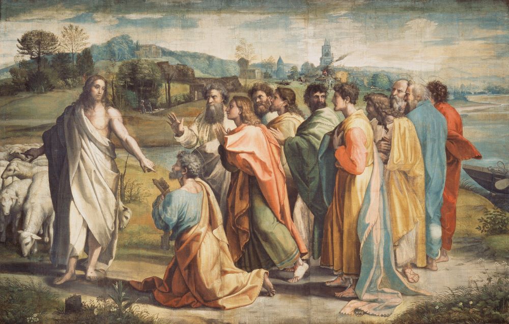 The drawing was made in preparation for one of the tapestries that Raphael had been commissioned to design for the Sistine Chapel: Christ’s Charge to St Peter. The keys that Peter holds refer to Matthew 16:19, but they are just there to identify the Saint. The incident depicted in the tapestry occurred later, after the resurrection, as you might be able to tell from the fact that Jesus is dressed in white, with ‘supernatural’ gold decorations. Rather than point up, as in the drawing, in the tapestry he points down to Peter with his right hand, and with his left he indicates a small flock of sheep. This is an illustration of John 21:15: