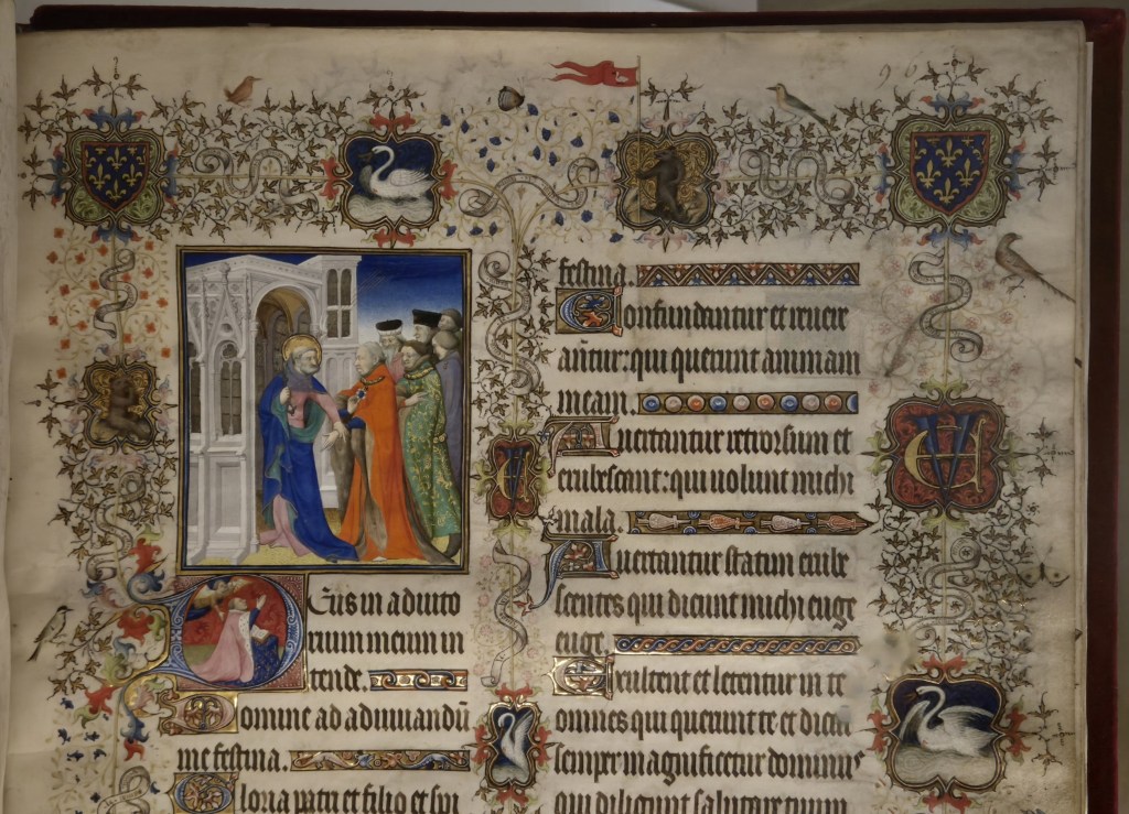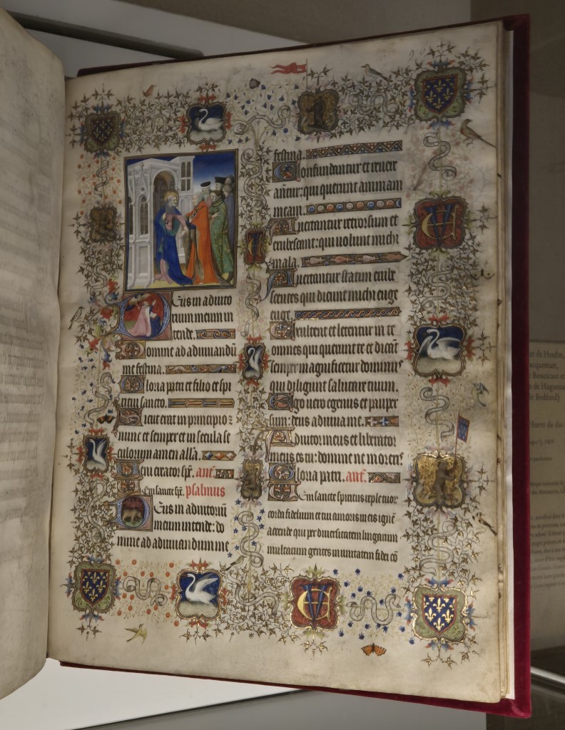 Last week we enjoyed the Très Riches Heures. However beautiful – and rich – the manuscript is, had it been finished it would have been just one of the books of hours commissioned by the duke. His library consisted of around 300 books – a large number in the days when all books were written by hand. A hundred years later, Pope Julius II had 220 volumes, housed in the Stanza della Segnatura, famously decorated by Raphael – although the Vatican Library was larger, already numbering 3,500 manuscripts by the time of Julius II’s uncle, Sixtus IV. At around the same time, Federigo da Montefeltro, Duke of Urbino, had about 900 volumes… But still, 300 was a lot, and around 127 survive, with many of them in the exhibition we will explore on Monday. They give a remarkable sense of the man, his interests, and his personality. As well as books covering science, history, philosophy and theology, among the books dedicated to his personal faith he owned 6 psalters (books of psalms), 13 breviaries (containing the religious services for each day), and 18 books of hours (for prayer and devotion during the ‘canonical hours’, the regular cyclical of worship established for each day). Of the 18, he commissioned six of them himself. Several of them, like the Très Riches Heures, get their name from references in the inventory created after his death. To give a sense of scale, each folio of the Très Riches Heures measures 290 x 210 mm, whereas the page we are looking at today is a lot larger: 400 x 300 mm. It comes from a manuscript which would have been rather unwieldy for private devotion, which also takes its name from the inventory, which lists “les belles grandes Heures de monseigneur que on appelle les trés riches heures, garnies de fermoers et de pippe d’or et de pierrerie, qui sont en un estuy de cuir” – ‘the beautiful large Hours of monseigneur which are called the very rich hours, adorned with clasps and piping of gold and precious stones, which are in a leather case’. It might seem to be confusing, perhaps, that they were also referred to as ‘very rich’, but the size would have been most striking. Les Grandes Heures, is probably best translated as ‘The Great Hours’, as ‘great’ has far more grandeur than ‘large’…