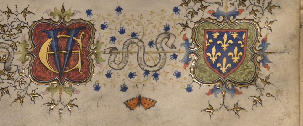 There is another ‘device’ or ‘emblem’ in this detail: the letters ‘EV’ written as a monogram – there are several examples on the page as a whole. The ‘V’ could be meant as a ‘U’ – they are often interchangeable. However, its meaning remains a mystery, even if there are several ideas. One suggestion is that, as a ‘U’, this could be an abbreviation of ‘UrsinE’ – the woman for whom the duke is supposed to have suffered love. I find this interpretation a little dubious. It could stand for Eveniet Tempus, Latin for ‘le temps venra’, while a third idea is that it stands for the words ‘En Vous’ – ‘in you’, as in ‘I believe in you’. This would be a sign of the Duc de Berry’s devotion to the Virgin Mary (with the ‘V’ also standing for ‘Virgin’). But, as I say, no one has been able to pin it down. Nevertheless, it is fair to say that the Duc de Berry was a religious man.