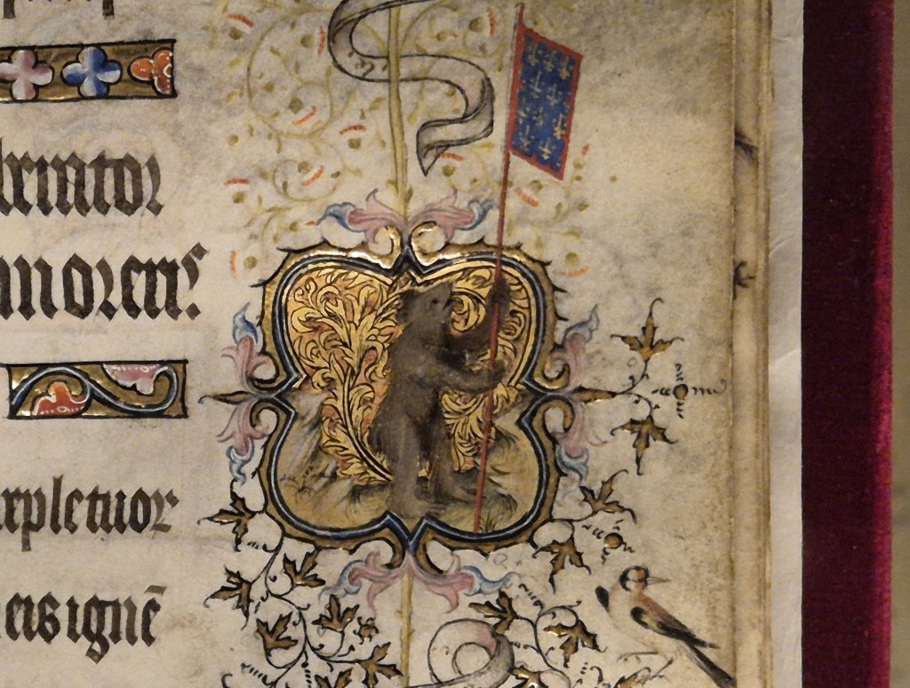 That is certainly true for the duke’s other main device, the bear, which he adopted before the swan. The first example dates back to 1364, and he continued to use it for the rest of his life – and even beyond. After his death in 1416 he was buried in the chapel of his château in Bourges (the capital of the Dukedom of Berry), and the heraldic beast at the feet of his effigy was a bear (we’ll see it on Monday). But what was the connection with the duke? He certainly kept bears, and, as we saw last week, he is wearing a bearskin hat in the depiction of January. But why? It helps to know the word in both English and French – and, for that matter, Latin. The French for ‘bear’ is ‘ours’, and that comes from the Latin ‘ursus’. It is not a coincidence that the first Bishop of Bourges – and indeed, the man who is supposed to have converted the town to Christianity – was St Ursinus. By choosing the bear, the duke acknowledged his devotion to this saint, and therefore also to the region of which he was made duke in 1360. In that same year, the Treaty of Brétigny was signed between the English and French, just one of the events of the Hundred Years’ War. The duke’s father, King Jean II, had been captured in 1356 at the Battle of Poitiers, and was still being held by the English four years later. By the terms of the Treaty, Edward III would renounce the title ‘King of France’, but still gained extensive territories in France. Meanwhile Jean II was held to ransom for 3 million écus, but was allowed to return home, with hostages used as a guarantee for the payment. In all around 63 men were sent to England, including two of the King’s four sons: Louis I of Anjou and Jean, now Duc de Berry. By the time Jean II died in 1464, the Duc de Berry had been in England for four years – and would remain for another five. It was at this time that his older brother became King Charles V, but 1464 was also when his use of the bear is first recorded. In the four years since he had arrived in England he must have learnt a lot of English. But then, as an educated man, he probably knew quite a bit before he went. He would certainly have known that the English for ‘ours’ is ‘bear’. And the English, who have always loved a pun (just think about Shakespeare), would surely have pointed out that, with his accent, it sounded like he was the Duke of Bear-y. And, believe it or not, most people think it’s that simple. It is worth pointing out that the bear often wears a collar, and sometimes it is also chained (it certainly is on his tomb): a captive bear, which perhaps also represents the duke’s captivity, the captivity of a strong and valiant warrior.