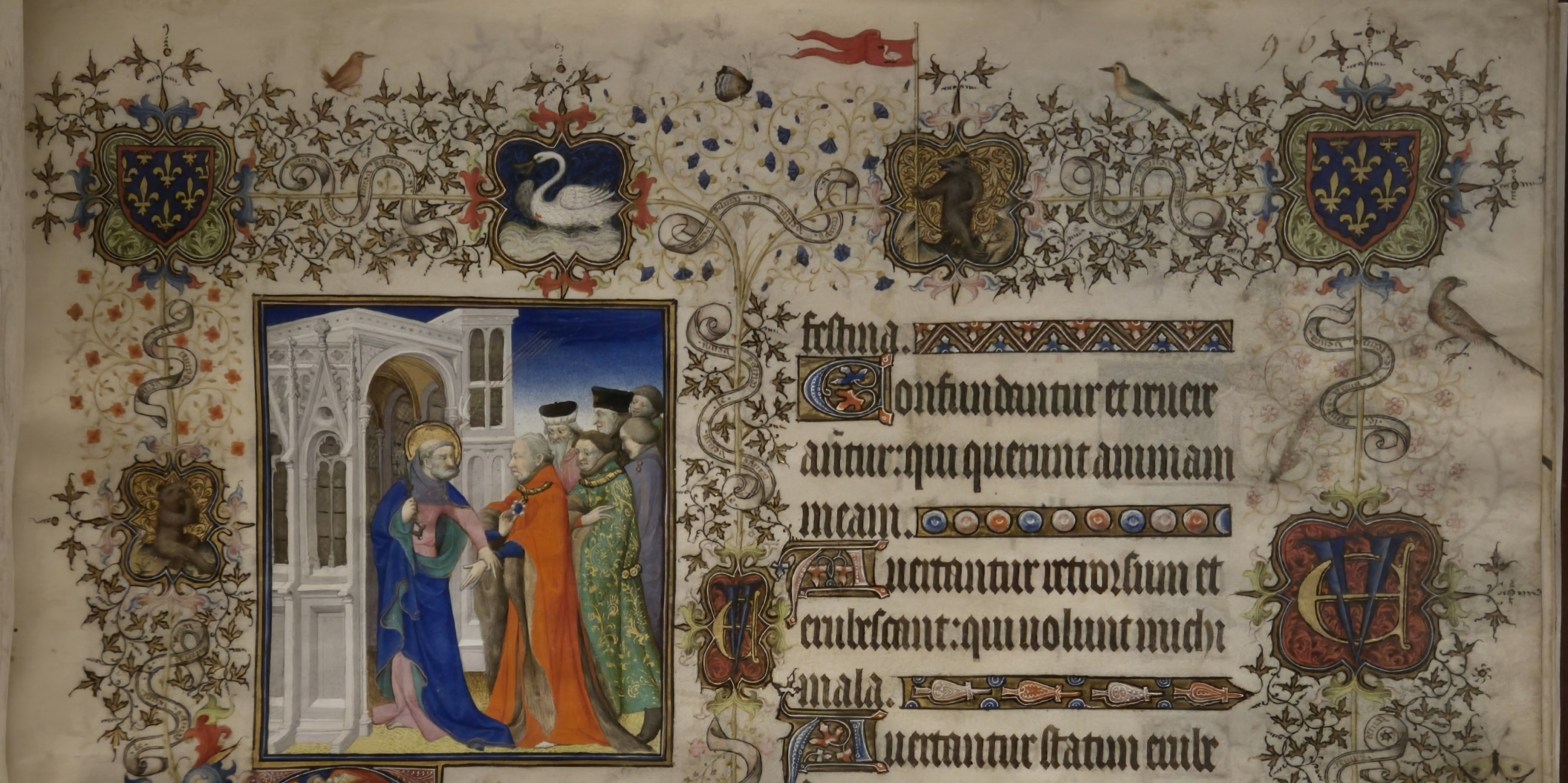 Last week we enjoyed the Très Riches Heures. However beautiful – and rich – the manuscript is, had it been finished it would have been just one of the books of hours commissioned by the duke. His library consisted of around 300 books – a large number in the days when all books were written by hand. A hundred years later, Pope Julius II had 220 volumes, housed in the Stanza della Segnatura, famously decorated by Raphael – although the Vatican Library was larger, already numbering 3,500 manuscripts by the time of Julius II’s uncle, Sixtus IV. At around the same time, Federigo da Montefeltro, Duke of Urbino, had about 900 volumes… But still, 300 was a lot, and around 127 survive, with many of them in the exhibition we will explore on Monday. They give a remarkable sense of the man, his interests, and his personality. As well as books covering science, history, philosophy and theology, among the books dedicated to his personal faith he owned 6 psalters (books of psalms), 13 breviaries (containing the religious services for each day), and 18 books of hours (for prayer and devotion during the ‘canonical hours’, the regular cyclical of worship established for each day). Of the 18, he commissioned six of them himself. Several of them, like the Très Riches Heures, get their name from references in the inventory created after his death. To give a sense of scale, each folio of the Très Riches Heures measures 290 x 210 mm, whereas the page we are looking at today is a lot larger: 400 x 300 mm. It comes from a manuscript which would have been rather unwieldy for private devotion, which also takes its name from the inventory, which lists “les belles grandes Heures de monseigneur que on appelle les trés riches heures, garnies de fermoers et de pippe d’or et de pierrerie, qui sont en un estuy de cuir” – ‘the beautiful large Hours of monseigneur which are called the very rich hours, adorned with clasps and piping of gold and precious stones, which are in a leather case’. It might seem to be confusing, perhaps, that they were also referred to as ‘very rich’, but the size would have been most striking. Les Grandes Heures, is probably best translated as ‘The Great Hours’, as ‘great’ has far more grandeur than ‘large’…