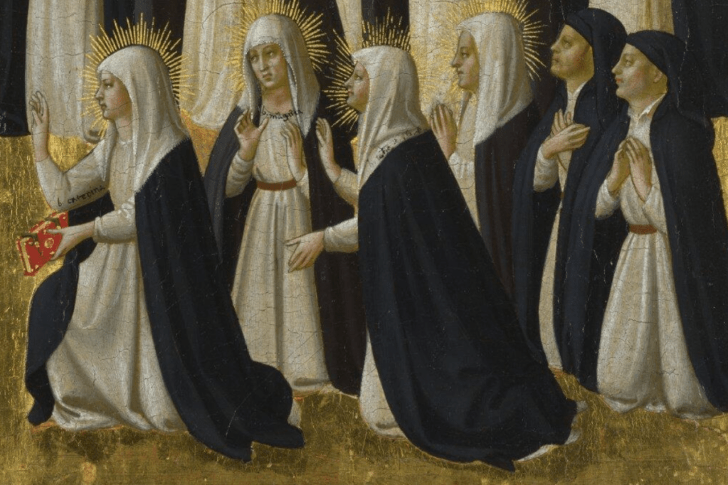 Two rows below him is the most important of the women in the right panel. She is named as ‘b. caterina’ – Beata (or Blessed) Catherine. Look at the delicacy with which she is painted – the tiny dots of white marking the fringing all around the hem of her headdress, for example, and the gilding of her bible, including the edges of the leaves of parchment. A Dominican tertiary who used her freedom to travel widely and speak truth to (male) power, in 1461 she was canonised as St Catherine of Siena (1347-80) by Pope Pius II – notably a Sienese pope. In 1939 she became co-patron of Italy (alongside St Francis, thus bridging the two major mendicant orders), and since 1999 she has also been one of the patrons of Europe. At the beginning of the 16th century a convent for nuns was dedicated to her on the opposite corner of the piazza from San Marco, and that is where the artist of the image on the right must have learnt to paint: Plautilla Nelli, some of whose works we will see on Monday.