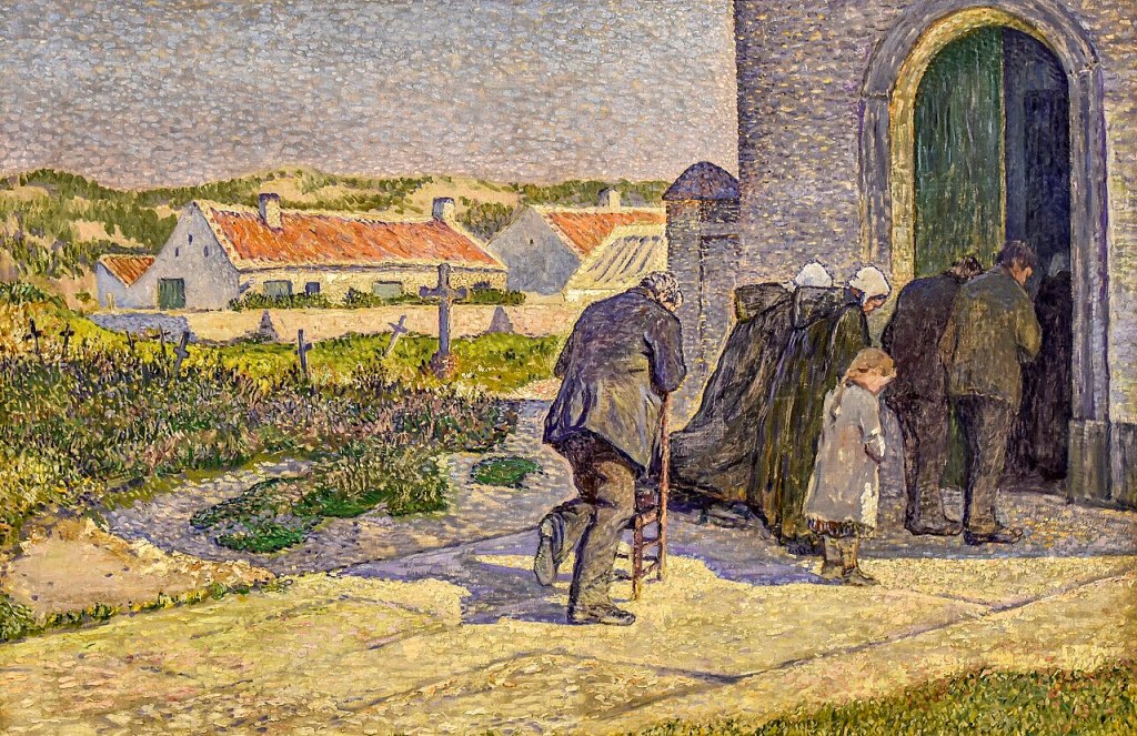 There is nothing about the architectural detailing to tell us that this is a church. The dappled walls are a purplish grey – not that dissimilar in hue to the shadows on the ground – while the inner edge of the door frame, which is catching the sunlight, is built up from dashes of a cream-coloured paint. There are flecks of this same light colour among the darker shades of the purple-grey walls. It is clearly a large building – the door is nearly twice the height of the people outside – but there is no decoration, no ‘symbolism’, to tell us that it is a church. So how do we know? In part, we rely on the behaviour of the people depicted: they bow their heads in reverence. Of course, the title also helps: During the Elevation. This is a key moment during the Mass: it is during the elevation of the host, when the priest ceremonially lifts the communion bread, or wafer, above the altar, that transubstantiation takes place. In Roman Catholic belief this means that the bread becomes the actual body of Christ. Hence the reverence: God is imminent, physically present among these people. So strong is the faith of this devout community that the church is full, and people remain outside. One of the large, green shutters of the door has been pushed open to reveal the shadowy interior, but all we can see is a dark grey rectangle, and the indistinct form of a woman near the door who is wearing what is presumably the same sort of dark, hooded cape and white headdress worn by the two women stood next to the child outside. It is not clear why the man at the back of the group has a chair – but maybe he cannot stand for the full duration of the Mass. Nevertheless, he is standing at this significant moment, having turned the chair around for support.