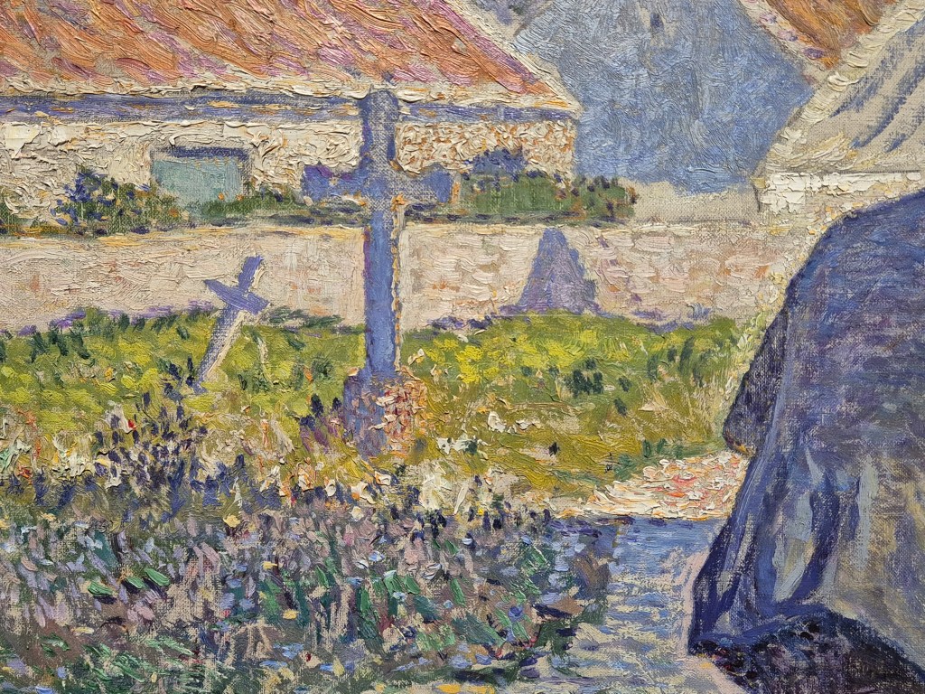 There are maybe as many as eight more crosses visible here – one is cut off by the frame at the far left of this detail, and one is just a vertical stroke of paint (so might not be a cross at all). Again, a sense of history (or geographical insecurity?) is revealed by the various angles at which they lean. The shadow of the church does not create such a clear-cut line here, but that is presumably because the ground is not so flat, or the plants are growing more unevenly. The sun shines brightly on parts of the wall surrounding a building beyond the graveyard. It has an orange-red slated roof, and its gabled end is in shadow. Behind it are dunes, with patches of vegetation growing in the sand. We are on the edge of the sea, in a small fishing village in Belgium not far from Ostend.