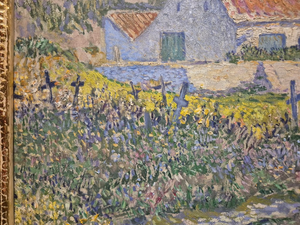 The extreme variation in brushstroke adopted by Anna Boch is best seen on the roof of the building to our left of the curious architectural form. The edges of the roof are defined by short, curved, brushstrokes of white paint, almost like the rectangular ‘tiles’ of the Impressionist tache, or ‘mark’, created with one short stroke of a flat brush. The roof itself, though, is made up of a series of long, parallel, diagonal strokes made with a fairly dry brush. This has left little paint behind, with the pale beige ground visible behind the broken, uneven strokes. This technique might remind you of another artist, one who is far more famous now than he was then. To my eye, this roof looks just like Van Gogh. The painting dates to 1893, whereas Vincent died in July, 1890. His work was still not well known to the general public – but Anna Boch was not the general public. Van Gogh’s reputation amongst his colleagues was running high, and in January 1890 – just six months before his death – he was invited to exhibit with Les XX. Six of his paintings were exhibited, and one of them, The Red Vineyard, was actually sold – the only one of his paintings sold from an exhibition during his lifetime. And yes, it was Anna Boch who bought it. Until recently, if she was known at all, she was known as the woman who bought a Van Gogh. Independently wealthy, she was able to pursue a career as an artist, and to collect the works of colleagues she admired. However, until recently her own paintings were relatively little known. An exhibition of her work staged at two venues, Ostend and Pont-Aven, took place between 2023 and 2024, and this has finally put her more firmly on the map. It has certainly led to her inclusion in Radical Harmony at the National Gallery, even though her work was not collected by Helene Kröller-Müller. We can’t be sure why not.