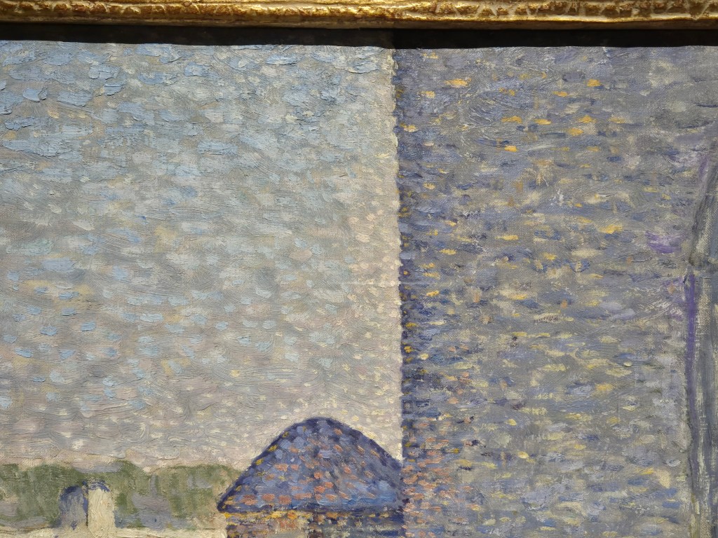 If we move down the left-hand side of the painting a little, we see a riot of different coloured brushstrokes. While the roof of the back section of the building has a series of parallel strokes, elsewhere the application of the paint is not directional. There are short flicks of the paint, dabs of light and shade, and small, luminous dots. The colours in the shadow are far more varied than they are in the sunlight, where there is a pale lime and a darker bottle green, almost as if the brilliance of the sun is bleaching some of the colour out. In the shadow we can see pale blues, lavenders, pinks and greens, and touches of black (or is that a very dark purple?). The crosses, on the whole, are built up from single bold strokes, although these are modulated somewhat according to what is growing around them. This variety of types of brushstroke really goes to show the problems with naming this style ‘Pointillism’. First, in English, the word ‘point’ has a slightly different meaning to the equivalent in French. The translation into English of the French word ‘point’ (pronounced ‘pwuh’) would be ‘dot’, whereas in English, the word ‘point’ suggests – to me at least – an almost infinitesimal, dimensionless mark. Even if we define ‘point’ as ‘dot’, this painting is not built up from dots. Yes, there are dots, but there are also dabs, dashes, flicks, and strokes, not to mention some broad areas of palin colour. A better name for the style might be ‘Divisionism’, a term which is often used. This is because the individual colours are divided into separate brushstrokes, rather than being blended together on the palette before being applied to the canvas. The reasoning behind this comes from Seurat, who thought that, when mixed on the palette, the colours lost their original brilliance. However, if applied separately, and in small brushstrokes, the original colours would blend in the eye, and not only would they maintain their luminosity, but they would also interact with one another to create an unparalleled freshness. This freshness, together with the liveliness of the painted surfaces, are just two of the most striking features of the National Gallery’s exhibition. However, the name which the artists themselves settled on was ‘Neo-Impressionism’. They saw themselves as taking a new approach to Impressionist ideas about light and colour, and the ways in which these technical means were used to say something about the contemporary world, while also giving their paintings a greater sense of permanence, harmony, and often, even, political relevance – which was, in its own way, radical.