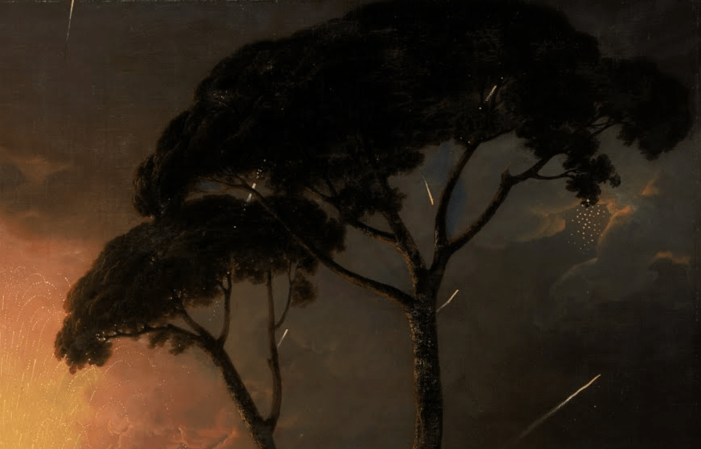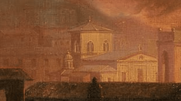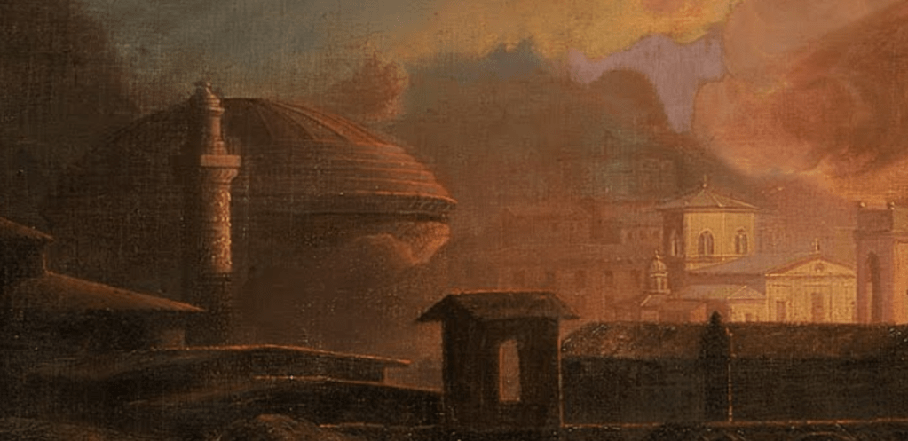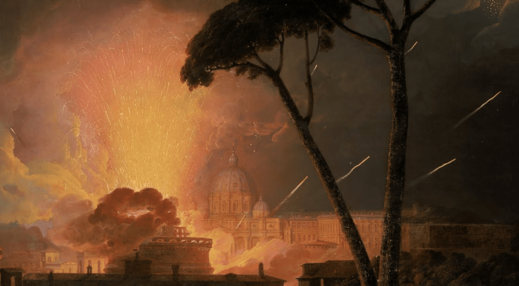 At first glance you might wonder if we are looking at a natural – or manmade – disaster. In the dark of night the most enormous explosion seems to have taken place, an eruption of fire amid sizeable buildings. Fortunately, though, we are at a safe remove, with two tall umbrella pines acting as a screen, letting us know how far away we are from the fire, the smoke and all the sparks: we are definitely standing well back. A dark row of buildings marks the edge of a town, or city, with the furthest building – as far as we can see so far – being a large church with a notable dome. To one side of it, palaces are lit up with the golden glow of the conflagration, and facing it a round building is all-but enveloped by smoke. Sparks fly up into the sky in all directions.