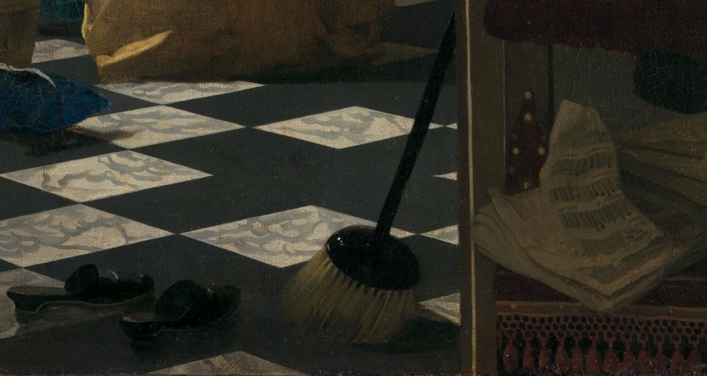A broom leans against a wall behind the door, and two slippers are left on the floor. Between them they take up the full width of the doorway. They are not in their proper place, and nor are they put to their proper use. The household chores – and the management of the household – are apparently being neglected. The maid would be responsible for the former, and the lady of the house the latter. Maybe the lady of the house has other things on her mind… Not only that, but once you get close enough you can see that the crumpled paper on the chair is actually sheet music. Even though what is written makes no sense, musically speaking (Vermeer seems not to have been worried about that), the implication is that the harmony created by well-played music has been set aside. This might have a bearing on the state of the household: there may be discord, and disorder.
