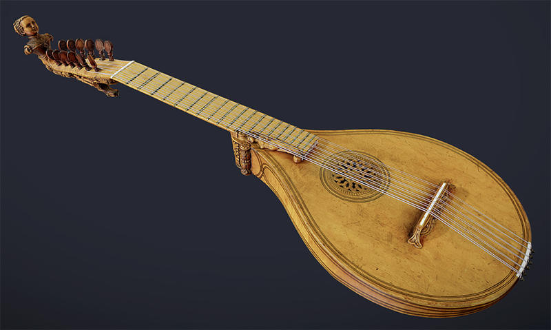 It is a cittern, as you can see by comparison with this example (from the Ashmolean Museum in Oxford), which was made in Italy around 1570, and is attributed to Girolamo Virchi. Citterns tend to have a flat back, as opposed to the rounded back of the lute, and the strings are made of metal, as opposed to the gut, which is used for lutes. As a result, they sound very different. In the interpretation of Dutch 17th century paintings this difference is important for a very specific reason: the Dutch word ‘luit’ was used as slang for the female genitalia – which can have implications for any woman holding a lute, or any man playing one anywhere near a woman… Nevertheless, the cittern is still a musical instrument, and given that we are in the 17th century, and that Shakespeare probably wrote Twelfth Night around 1601-02 at the beginning of the century, it is well worth remembering that the play opens with the lines,