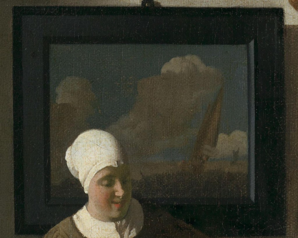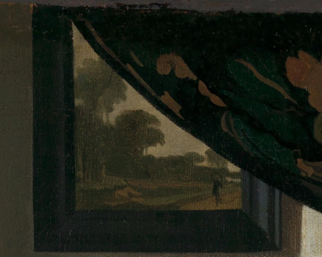 Not only has drawing back the curtain allowed us to see what is going on in the inner room, but, as this detail shows, it has also revealed most, but not all, of the upper of two paintings. I’m sure there’s not much we can’t see, as the curving line of the fabric traces the height of the distant trees: all that is hidden must be sky. This could be a version of a real painting. As we will see on Monday, it was quite common for Vermeer to use paintings he knew. Some were in his mother-in-law’s personal collection, some were by artistic associates – members of the Guild of St Luke in Delft – and some might have been passing through his hands as an art dealer. However, he would often edit them, taking just one detail, or changing their scale, according to the composition he was working on. I don’t know if anyone has ever found a source for this particular image, but I’m sure the trees have been edited to fit the curve of the curtain. It is a landscape (though in a portrait format, but this isn’t unusual), with a path or track leading towards us in the bottom right corner. There is a single figure, which I see as a man walking towards us – his two legs are distinct (a woman would be wearing a full-length skirt). I’m assuming he’s walking towards us as that was a reasonably common occurrence in Dutch landscape paintings. He is, arguably, the last thing to be revealed by drawing back the curtain, leading us to ‘dis-cover’ (quite literally) a man approaching us. This may well relate to the contents of the letter, which might inform the lady that a man is returning from the outside world.