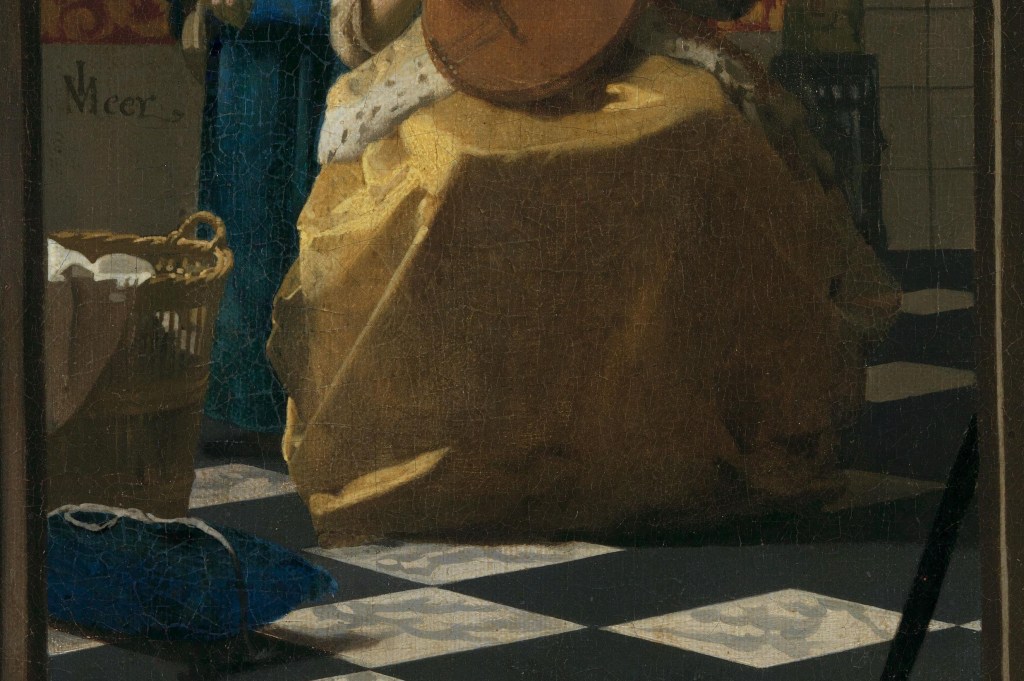 Having negotiated these obstacles to get into the room, we are in the presence of a finely dressed lady and a maid – presumably her maid. The difference in status is marked by their clothing. Whereas the lady wears a yellow satin jacket trimmed with broad bands of fur, as well as a pearl necklace and earrings, the maid has a plain brown top over a chemise, plain blue skirts, and no jewellery. However, the maid stands over her mistress, dominating her. Not only that, but her left arm is ‘akimbo’ – a pose almost always adopted in 17th century Dutch portraits by men rather than women (although there are a few exceptions). You could see this as an equivalent of contemporary ‘manspreading’, allowing the men to take up more space and so look more important. Not only that, but the maid’s headdress is quite tall, and catches the light brilliantly, thus enhancing her importance within our visual field. Nevertheless, there seems to be a good relationship between the two. We do not know what has happened – and that is one of the great strengths of Vermeer’s art. He gives us so much of the evidence we need to work out what is going on, but not everything: we can tell our own stories through his paintings, and they can all be different. The lady is holding a letter, which appears to be unopened. She looks round, and up, towards her maid – who has presumably given it to her (although we have no way of proving that she has) – and the maid looks back, her face slightly lowered, with the hint of a smile. The lady is clearly concerned, the maid, somewhat amused. Her stance is down to earth, matter of fact, though: whatever the contents of the letter (and how could she know?), it clearly isn’t going to affect her that much. However, the two are pictorially bound together. Quite apart from the fact that they are perfectly framed by the door, the top of the maid’s white apron, which we see above the blue overskirt which has been hitched up, continues along the line of the white fur trim of the lady’s jacket, tying them together visually. The upper edge of the brown sleeve on the maid’s left arm also leads to the top of the lady’s head, and the inside of the crook of her elbow is level with the top of the gilded leather panel we can see through her arm. Both coincide with the lady’s right eye: everything in Vermeer’s compositions was always very precisely planned, and extremely specific. Notice the placement of his signature at the bottom left of the detail above, for example – not stuck away in a corner at all, but conveniently close to the action.