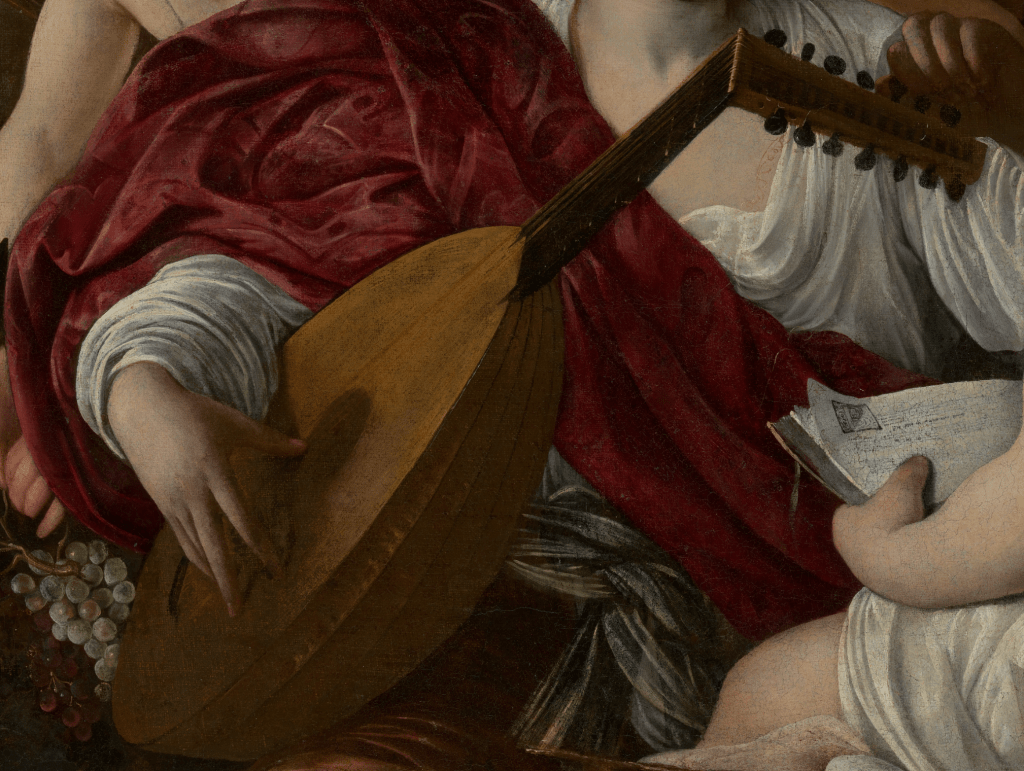 The sculptural form of the lute is precisely defined. The soundboard catches the light entering the room from the top left, while the back, or shell of the instrument is cast into shadow, with the exception, perhaps, of the top ‘rib’. However, there is not much detail, and we can’t see all the strings. Sadly, despite its wonderful appearance, the painting is not in a very good condition. After the death of the Cardinal, the painting passed into the hands of a French collector, and was later briefly owned by another Cardinal, the famous (or infamous) Cardinal Richelieu. However, by 1675, we know it belonged to the Duchesse d’Aiguillon, as it is mentioned in an inventory of her collection. By then the canvas had been stuck to a wooden support, from which it was later removed. At either stage this may have resulted in losses to the surface, and could, consequently, explain the lack of detail in some parts of the painting (I’m indebted to Keith Christiansen’s 2017 catalogue entry for this painting on the Met’s website – you’ll have to scroll down and click on their ‘catalogue entry’ button – and, while I’m about it, I’d also recommend his Instagram feed: @keithartnature).
