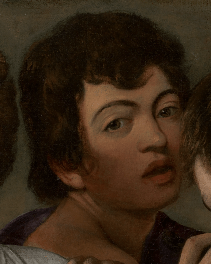 Technical analysis shows that his right arm was painted first, and then the full, red drapery which encompasses it was added on top. The brocade cloak, or shawl, flows over his elbow and frames his hand, its curve echoing the arch of his wrist. It fills out the figure, and broadens the form, and it is this, as much as anything else, that gives the lutenist his prominence. From his shoulder the brocade crosses his body on a diagonal, in opposition to the neck of the lute. Together they form an ‘X’ in front of his chest, the top ‘V’ of which helps to frame his sultry gaze. His left elbow is hidden behind the unclad arm of the boy on the right, while his head tilts towards that of the figure at the back.
