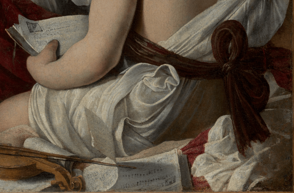 This book is just one of the still life elements in which Caravaggio both delighted and excelled in the earlier stages of his career. Another score sits on the table with a violin resting on it. They are so brilliantly conceived that I will show you more details below. The sash is tied in a bow, the ends of which appear to caress the white fabric beneath them. Bows like this occur more than once in Caravaggio’s oeuvre, and here, as in other places, it is as if we are being invited to tug on the end, and release the bow, or to toy with the loops, or the knot – but that’s probably an idea that I am transferring from another painting, Caravaggio’s voluptuous, seductive Bacchus in the Uffizi. If you don’t know it, click on that link! In our painting, the white drapery forms a turbulent swirl just beneath the belt, and wraps in numerous folds around the boy’s thigh. There is clearly enough fabric to cover his knee, but enough leg is visible to prove a point: these models are wearing less than they would normally.