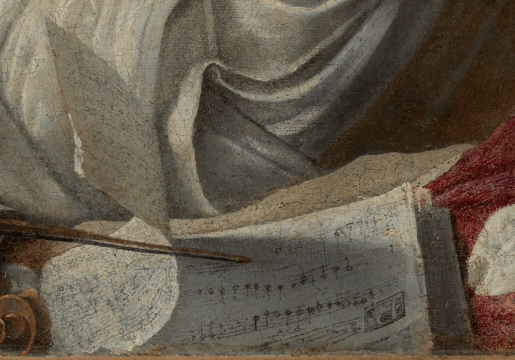 However damaged the surface of the painting, we can tell how brilliantly crafted this manuscript was. The music cannot be read, but we can tell the difference between the thick, pinkish cover of the book and the darker edges of the pages, and then see the light catching the corners, where the top page has curled up, casting its own corner, decorated with a large letter ‘B’, into shadow.