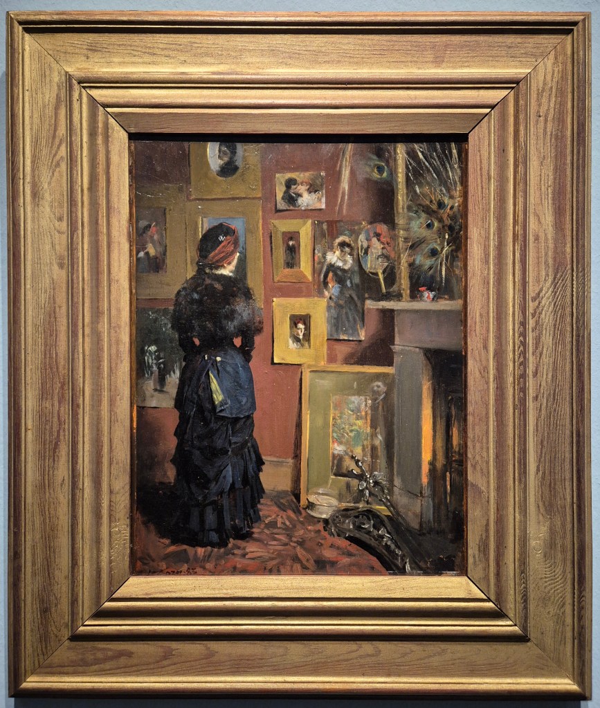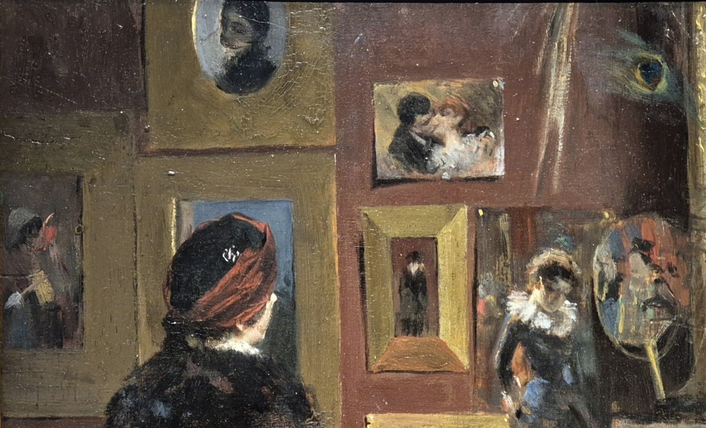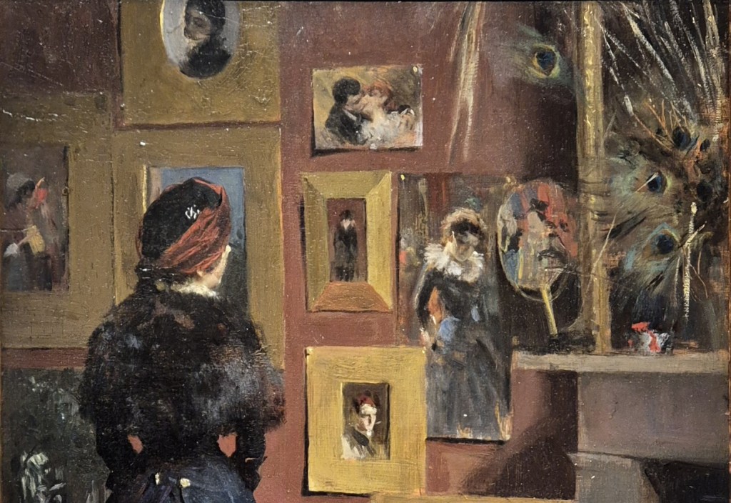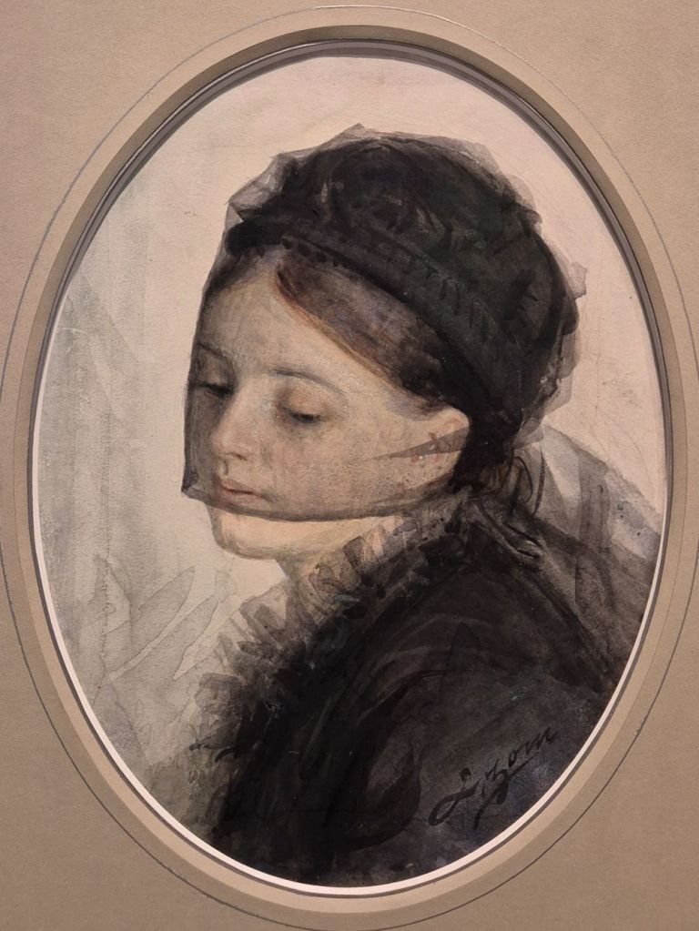 The woman wears a black hat with a very broad maroon ribbon wrapped around it – or a headdress that is mainly built up from this ribbon (…I’m not a milliner!). Her head is beautifully framed by a painting in a flat, broad, gilded frame, and painted sky can be seen around her hat. The ‘profil perdu’ – or lost profile – stands out brightly against what is probably dark vegetation in one of Zorn’s many early landscapes. The visiting woman is looking at a painting of another woman, who also wears a black dress, but with a large white collar, almost like a ruff. This painting is not framed, and two white dots in the top left and right corners tell us that it is a watercolour, on paper, which is pinned to the wall. Two other images have been placed over it. The bottom left corner is covered by another broad, flat, rectangular frame, containing an image of a young man (probably…) looking down. The top right of the watercolour has a Japanese fan (… or at least a Japanese-style fan) propped in front of it. This is the one image I mentioned that is not by Zorn. It shows him to be a member of the avant garde: artists such as Whistler, and others in the Aesthetic Movement, who were strongly influenced by Japanese art. The peacock feathers which are in front of what I assume is a mirror are another feature connecting Zorn to the latest trends in British art: the Aesthetes would swoon.