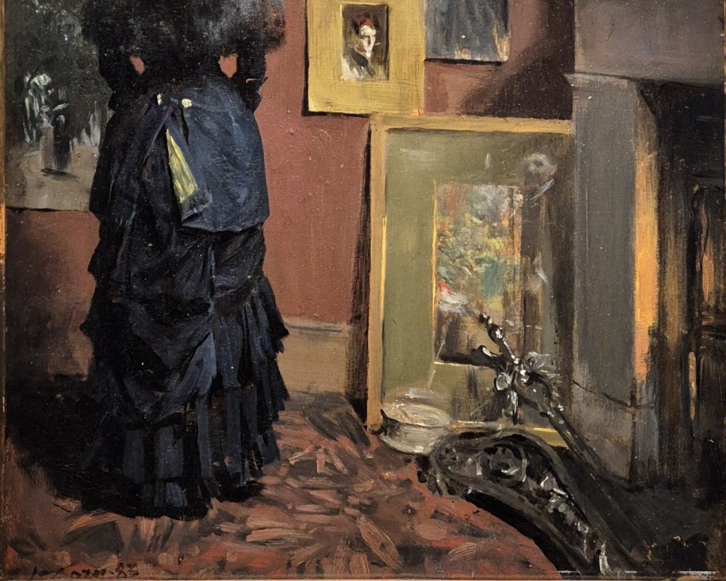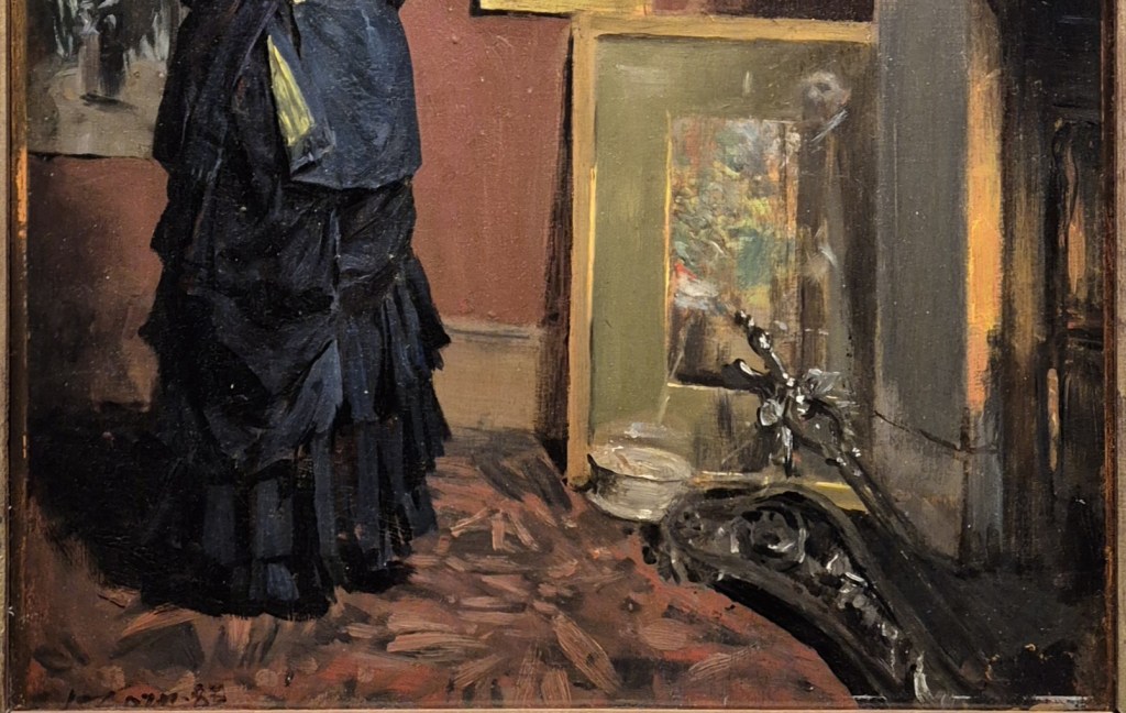 At first glance it might not appear to be about Zorn at all – even if we can assume, given the title (Zorn’s London Studio on Brook Street), that this woman has come to look at Zorn’s paintings. We could also assume that all the images in this room are by the Swedish artist – however, there is one exception. It is a well-appointed room – richly decorated with brick red walls and a fitted carpet patterned with brick red and black. We don’t see any of the ‘quality furniture’ I mentioned above, but there is a warm glow coming from the fire, so there is no economising on fuel. Given that the top of the frame of the highest exhibited painting is not visible, we can also tell that there is a high ceiling. This is a large room, warm and comfortably appointed: Zorn shows us that his lifestyle is very far from the romantic idea of a starving young artist. He also shows us how productive he is. Even in this corner of the room nine of his works can be seen, framed or unframed, on the wall or on the floor. A fashionably-dressed woman, clad in black, has arrived to look at the work, and is standing with her back to us, looking to her right so we just see her face, her gaze encouraging us too to look at the pictures on display – she is, effectively, a repoussoir.