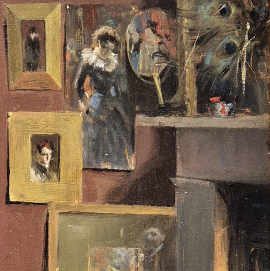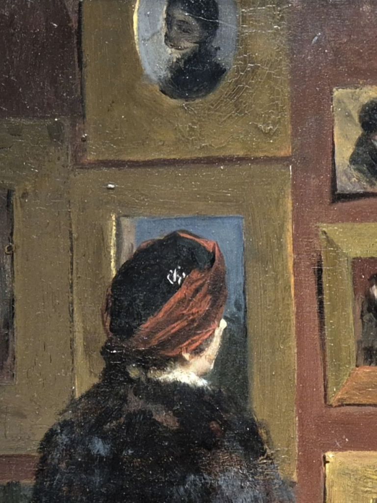 Sitting on the mantelpiece is a small white box with a red ribbon: little flashes of red like this are almost a signature motif for Zorn. If we tone this colour down to the maroon of the woman’s hat, we can see the same colour echoed across the painting. It is used on the fan, in the watercolour (between the woman’s wasp waist and her arm), and in the painting on the far left. It isn’t that different to the brick red colour of the wall, all of which adds to the sense of a warm, harmonious setting. At the top of the painting is an oval image in a flat, gold frame. It shows a veiled woman looking down to our left. Anyone who knew Zorn’s work – or his reputation – would have heard about this painting. You have too: I mentioned it above.