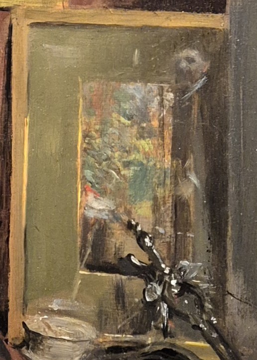 It is, in fact, a full-length reflection of a man in a dark suit with a white collar. His hair is dark, and his eyes are seen as pools of dark shadow. The edge of his nose catches the light, but his mouth also appears to be shadowed: it looks like he has a moustache – as Zorn did. Half-way down the right-hand edge of the garden scene we can see the reflection of a hand and a bright flash of white cuff. Who else could it be but Anders Zorn, watching over the visitor’s shoulder, offering information and advice, on hand to take a commission to make her look just like the woman with the large white collar? The fire irons lead our eyes into the painting, yes, but specifically they lead us to the glazed image bearing the reflection of the artist, a self portrait which is effectively looking out towards us. The fire irons lead us to his image, and they are balanced in the bottom left hand corner by his name, the signature on the patterned carpet. This really is all about Zorn – his studio, his works, his image, his name… his visitor.
