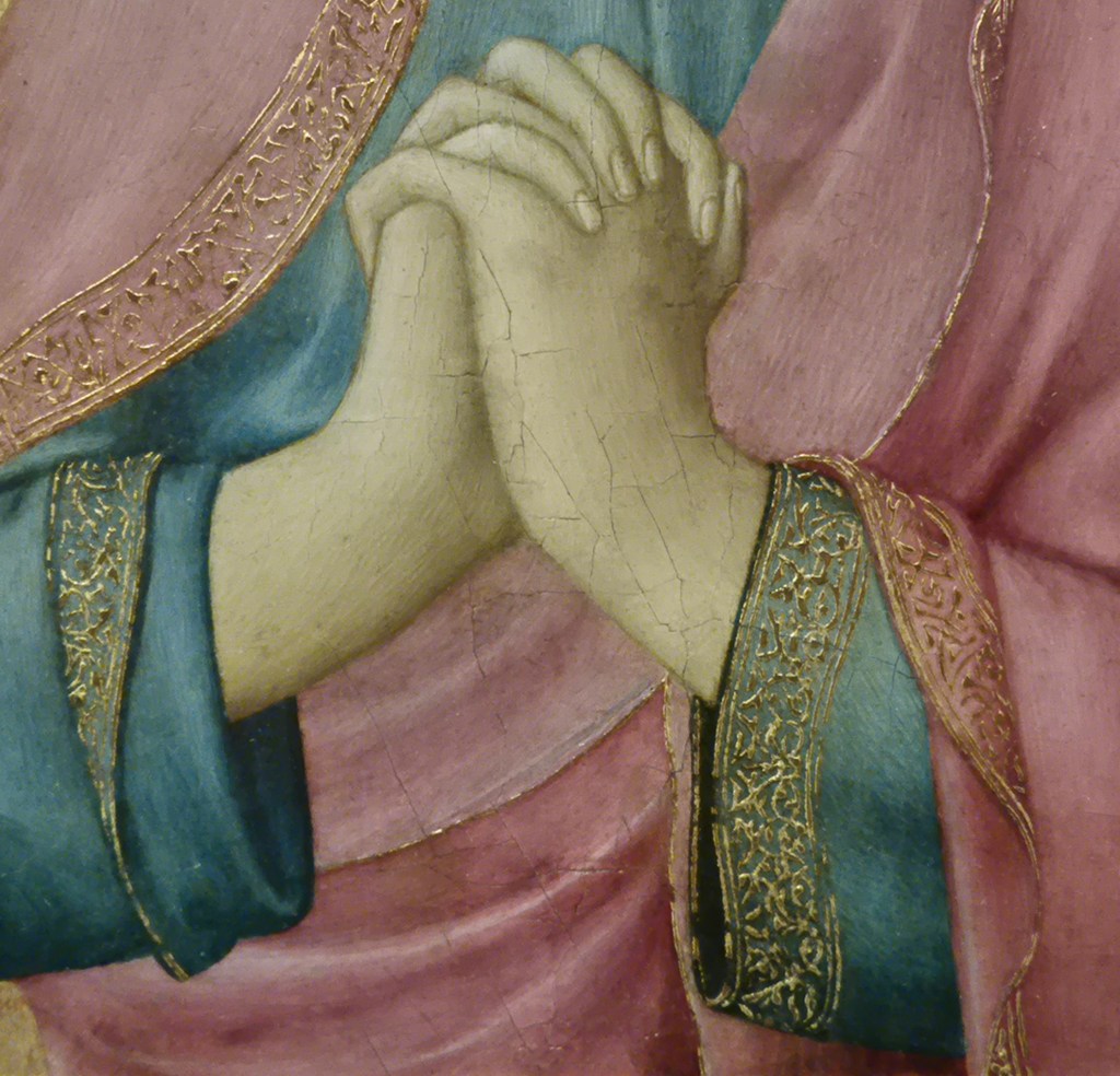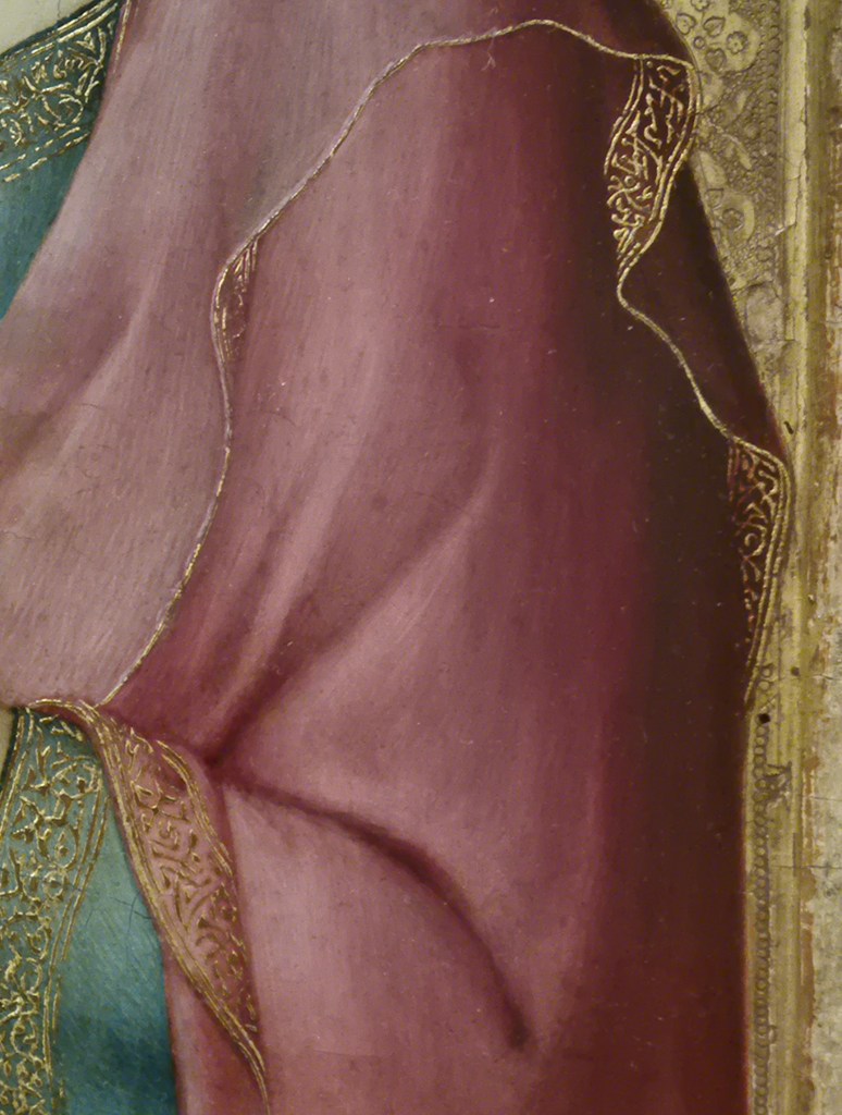 In the bottom half of the painting we can see five feet – three human, two sofa. It’s a sort of game, and one that Freud played in different ways in different works. Each foot has a different relationship to the floor (and Freud was always interested in relationships). The two carved wooden feet are connected by the sharp line of shadow cast by the edge of the sofa which, together with the glints of light on the curving bulges of these feet, reminds us that this was a night-time painting. Cook’s right heel rests on the floor, while his left foot remains unseen. Paul’s two feet, on the other hand(!), are firmly and securely planted, the toes turned out a little from the heels. And yet, how secure are they? A curious detail suggests that something might be awry.