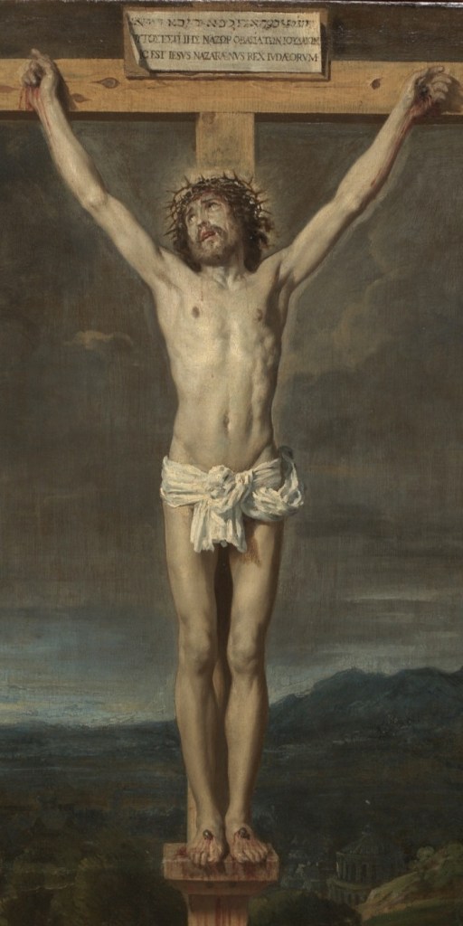 In my interpretation of the painting, I think it is entirely relevant that the face of the central figure appears against the deep blue sky. The window on the left is closed, that on the right is partly open, and in the space between we see the head of the central figure. This may appear to be another woman – the circle could be one breast, the curving black line around the pink and white form another. However, I think this figure represents a man: knowing that the ballet Mercure had three men cross-dressing as the Three Graces could be relevant. Why do I think that it’s a man? Well, for one thing, the position of the arms. Both are raised on diagonals going away from the torso. For those with a knowledge of Italian art, this won’t mean much, but if you are more familiar with Spanish painting – as, let’s face it, Picasso was – the gesture may be more familiar. Compare it, for example, with this painting from the Prado by Diego Velázquez.