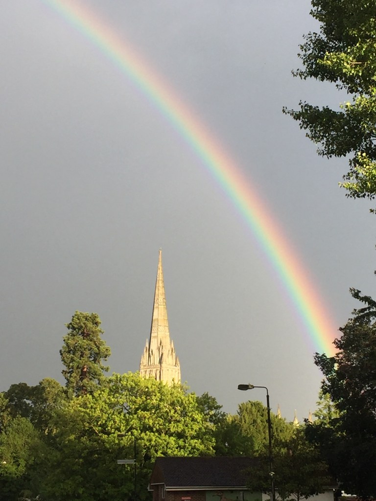 Coming forward and to the right again we see Brother Conrad – he is as sturdy (in his faith) as these trees growing in the wood, and he kneels between that fourth clump and the Cross, which is itself often described as the ‘Tree’ on which Jesus died – with Jesus as the fruit of the tree.