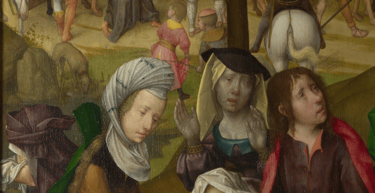 He is also granted more respect. Rather than the thieves’ skimpy thongs, he wears a more dignified – even if only slightly – loin cloth, a single piece of cloth wrapped once around and tied as a simple knot, the two ends blowing in the same breeze that lifts the Magdalene’s headdress. We know that the artist thought about Jesus’s appearance on the cross – he had to, in order to paint him – but theologians did too. The nature of his loin cloth is even discussed in popular devotional literature. One of the most important, and influential, of such texts were the Meditations on the Life of Christ, written, possibly, by John of Caulibus, a Franciscan Friar, for one of the Poor Clares – a Franciscan Nun – some time around the year 1300. In it, the reader is asked to imagine being present at any number of biblical events, and even to imagine their own participation, the aim being to evoke an emotional response, an instinctive understanding of the bible stories which could be far more profound than an intellectual appreciation. Here is a description of what happened at the crucifixion, concentrating on one aspect of the Virgin Mary’s feelings at seeing her son crucified: