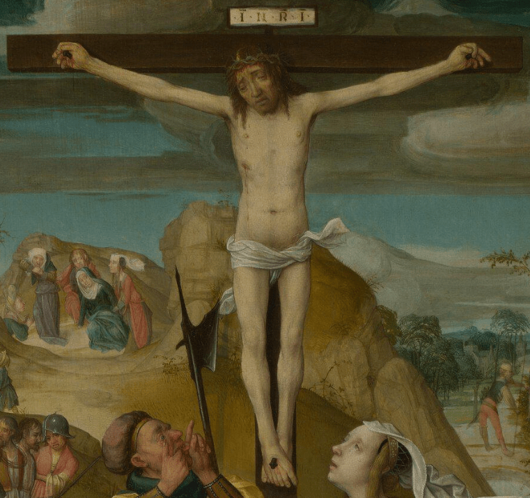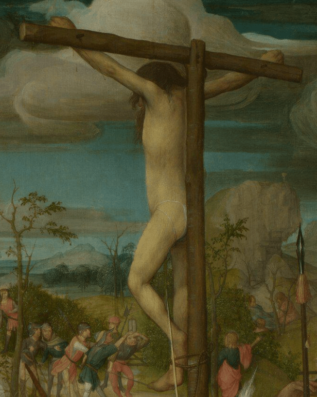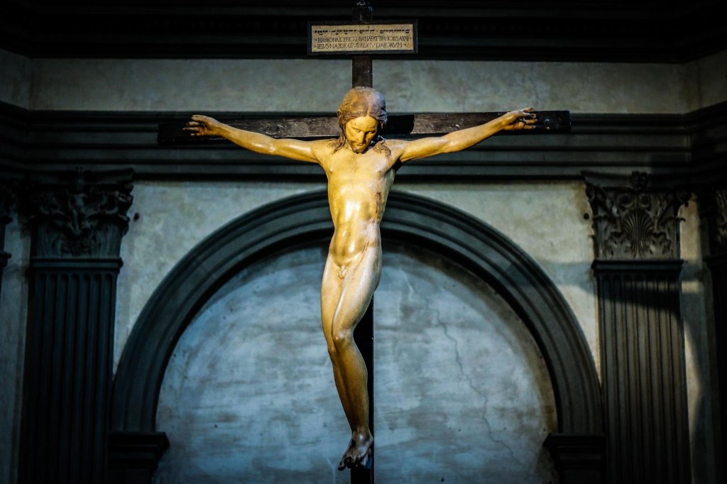 It was Roman practice, apparently, to crucify people naked – this was part of the humiliation – but out of consideration not only for the dignity of Jesus, but also for the viewer, he is almost always clad in some way. But not always: Michelangelo, for example, when he was only 17, left Jesus naked when he carved a crucifix for the Prior of Santo Spirito in Florence.