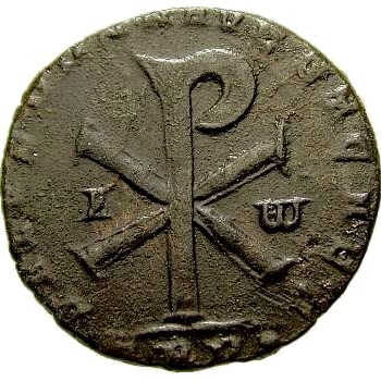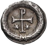 The cross on which Jesus is crucified in the painting is slightly more sophisticated than those of the Good and Bad Thieves. It is made out of planks of wood, which have been sawn into a rectangular cross-section, whereas those of the thieves are made from the unworked trunks of young trees. But none of them are ‘cross’ shaped. They form the letter ‘T’, the Greek letter Tau, and indeed they are known as the Tau cross. There is no description of the appearance of the cross in the bible, as far as I am aware, but this image is the result of the word used for ‘cross’ in early Greek versions of the testaments – σταυρός (stauros). And no, I don’t speak Greek. As Casca says in Shakespeare’s Julius Caesar, ‘but, for mine own part, it was Greek to me’ (the ‘all’, with which we are all so familiar, crept in later…). Anyway, the literal translation of ‘stauros’ is ‘stake’, and implies that the instrument of torture and execution was stuck into the ground. An early Christian symbol, the staurogram, is a combination of the letters ‘tau’ and ‘rho’, an abbreviation of the word ‘stauros’, and was probably seen by the faithful as an abstracted image of Christ on the cross, with the ‘tau’ as the cross, and ‘rho’ as Christ – the loop effectively represents his head. As such, it is close to the chi rho, a far more familiar early Christian symbol, which is also formed from two letters, the first two of the word ΧΡΙΣΤΟΣ (Christos). Again, the visual reference to the crucifixion is apparent, even though neither actually shows the cross, that most humiliating form of execution. Here are two coins which use the symbols, from c. 570 and c. 350 respectively.